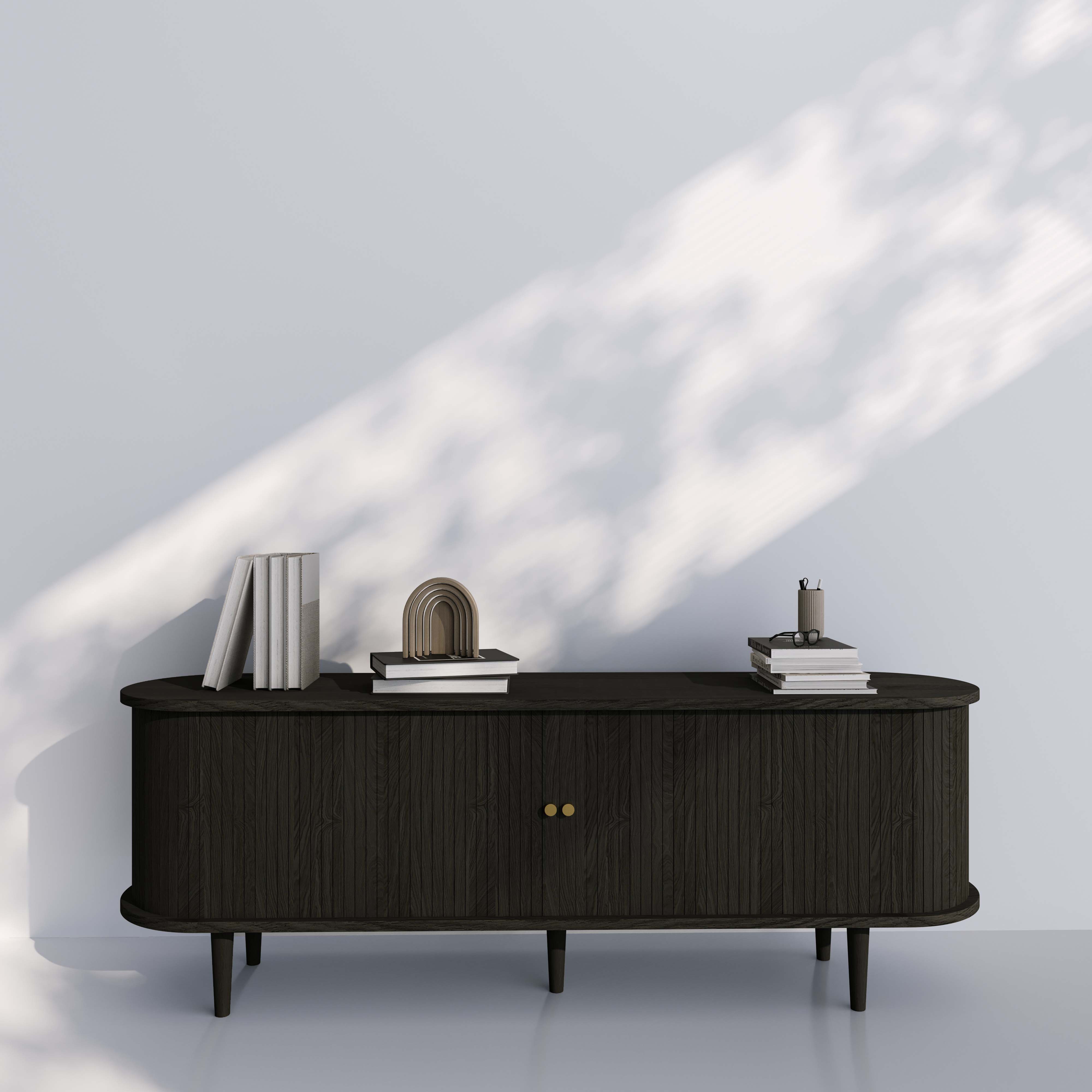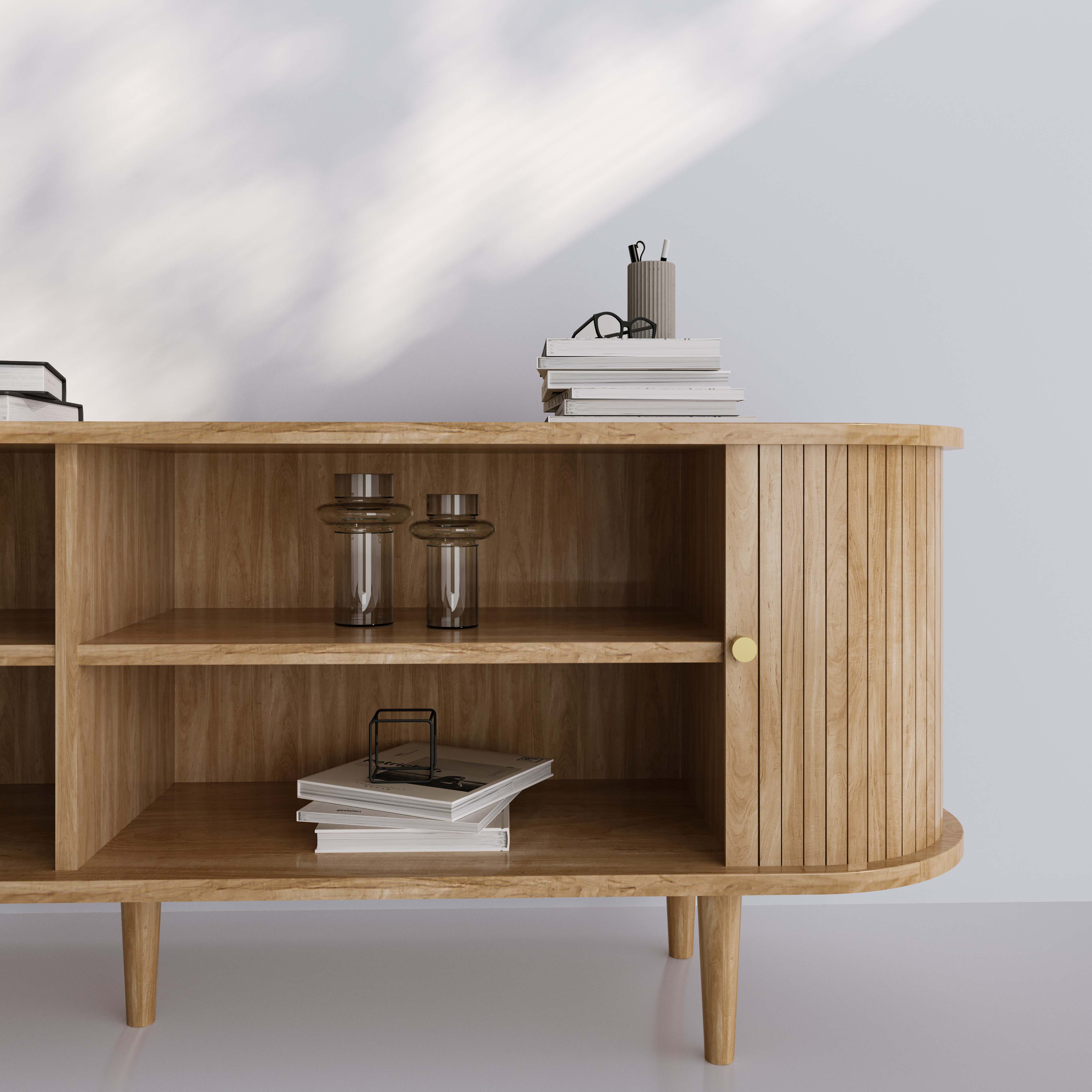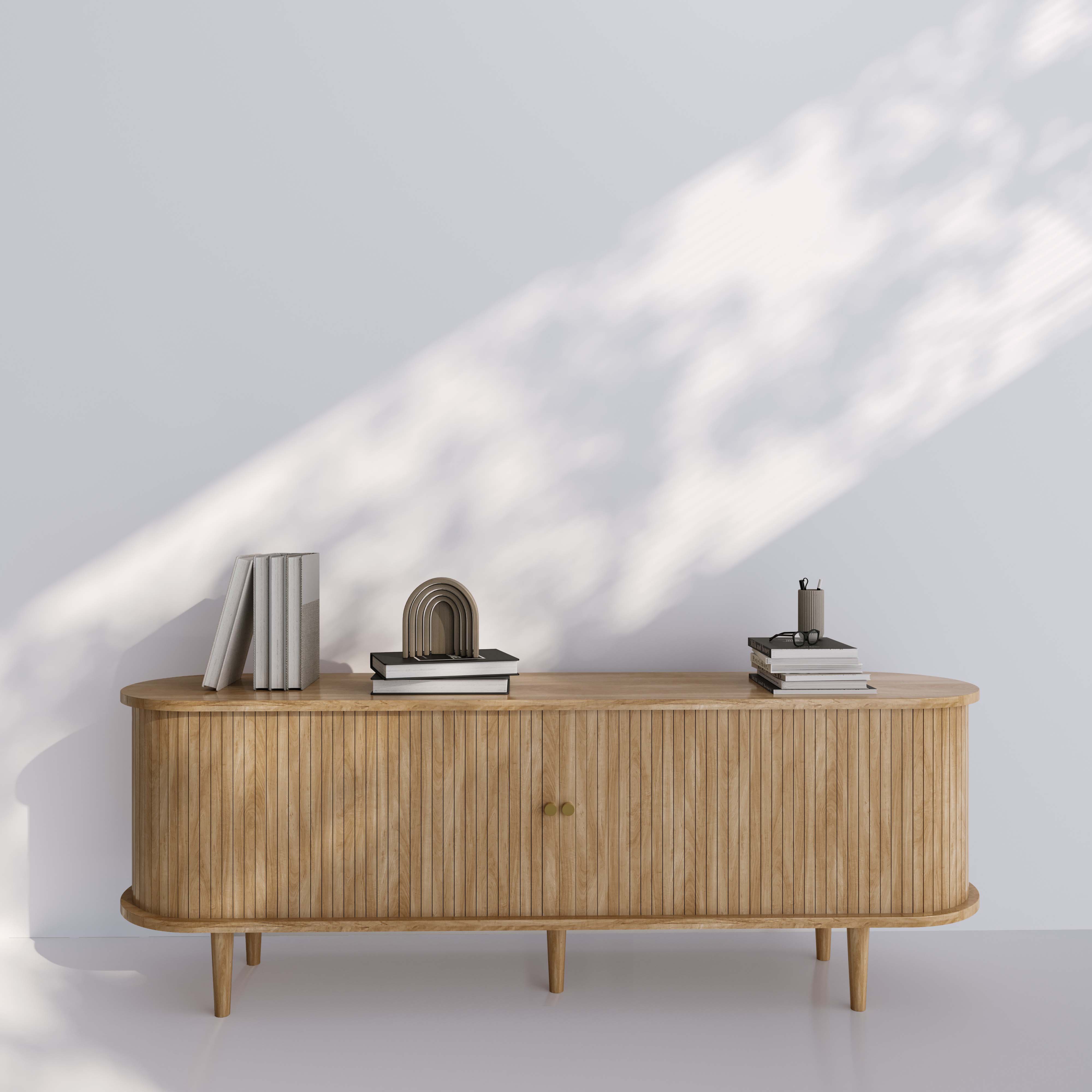 The Florence TV Stand pairs sculptural elegance with practical storage, creating a living space that feels elevated yet effortlessly relaxed. Its smooth oval silhouette and natural solid wood legs add warmth and balance, while the sliding tambour doors reveal generous compartments to keep tech, books, and clutter neatly tucked away. Clean, calm, and quietly luxe, just how we like it.