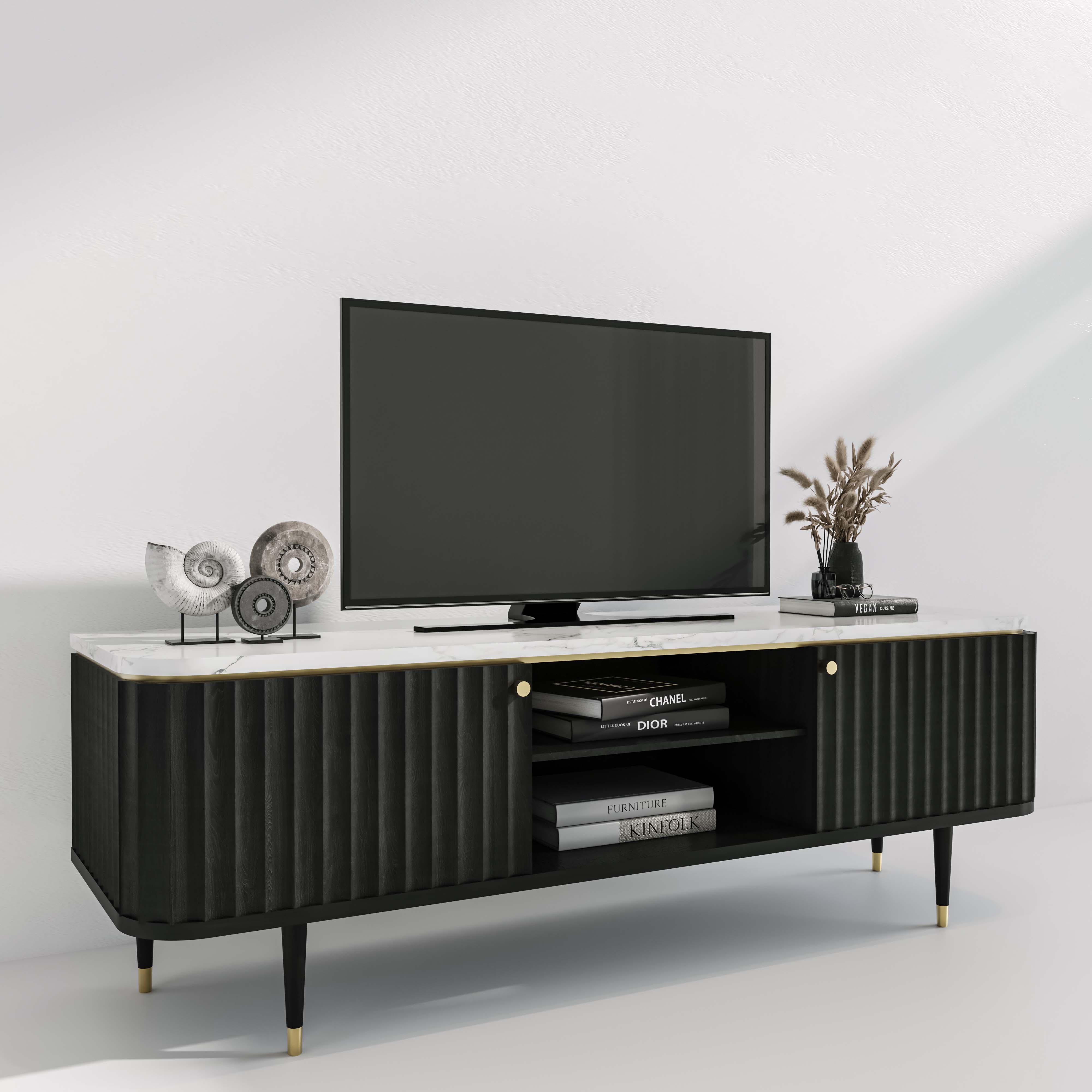 Bring timeless polish to your space with The Hudson Fluted Marble Media Unit. Designed with black-stained engineered & solid wood, fluted doors with a crisp white quartz marble top. This piece mixes mid-century and modern notes effortlessly. Brass-plated accents add a subtle glam touch, while the spacious compartments keep all your tech, consoles, and books tucked neatly away.
